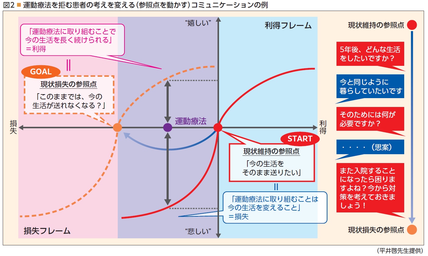 また、対象者に動機付けを行うことで、自律的に行動を変容させる動機付け面接というアプローチも有用です。患者の参照点が「今の生活をそのまま送りたい」という現状維持であるとき、運動療法に取り組むことは生活を変えることであり、損失と捉えられます。この参照点を「このままでは、今の生活を送れなくなる」という現状損失に対する危機感に変えることができれば、「運動療法に取り組めば今の生活を長く続けられる」ことを利得と捉えるようになると考えられます。